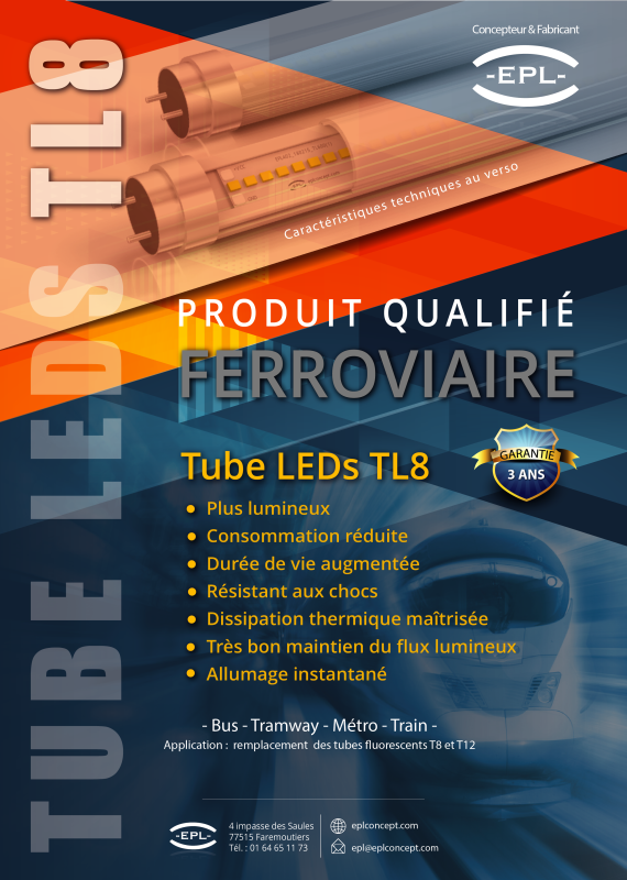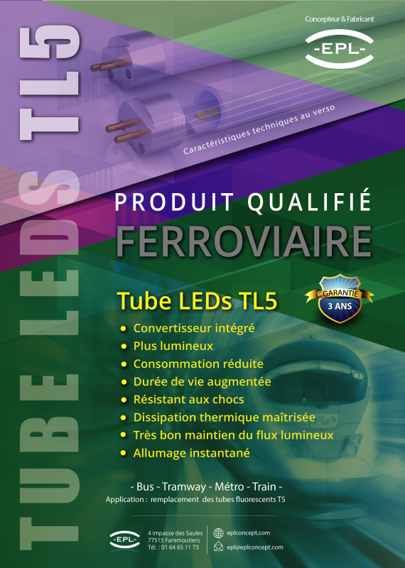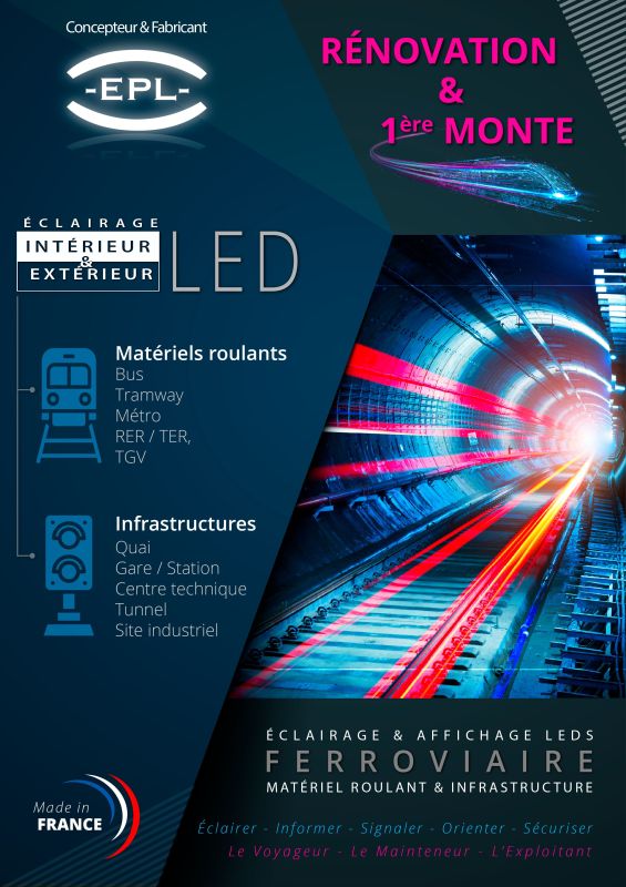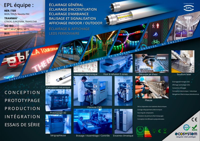 EPL conçoit et fabrique du matériel électronique et mécanique en Ile-de-France depuis 1996. Nous proposons des solutions d’éclairage et d’affichage LEDs destinées aux transports urbains et interurbains. EPL intervient dans la rénovation, la modernisation et la première monte de matériels ferroviaires. Nous apportons des solutions standardisées ou customisées, qualifiées ferroviaire (NF EN45-545, NF EN50-155, NF EN62-471…).