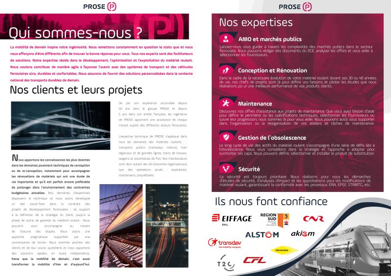 Créé en 1982, PROSE est un bureau d'ingénierie et de conseils indépendant, spécialisé dans le matériel roulant ferroviaire. Nos proposons des solutions couvrant tout le cycle de vie du matériel roulant, avec une approche d'intégration système aliant maîtrise sécuritaire et performance. Nos services proposés se déclinent autour de 4 domaines de compétences: Stratégie de flotte et acquisition, Développement et suivi de fabrication, sécurité et autorisation, maintenance et rénovation