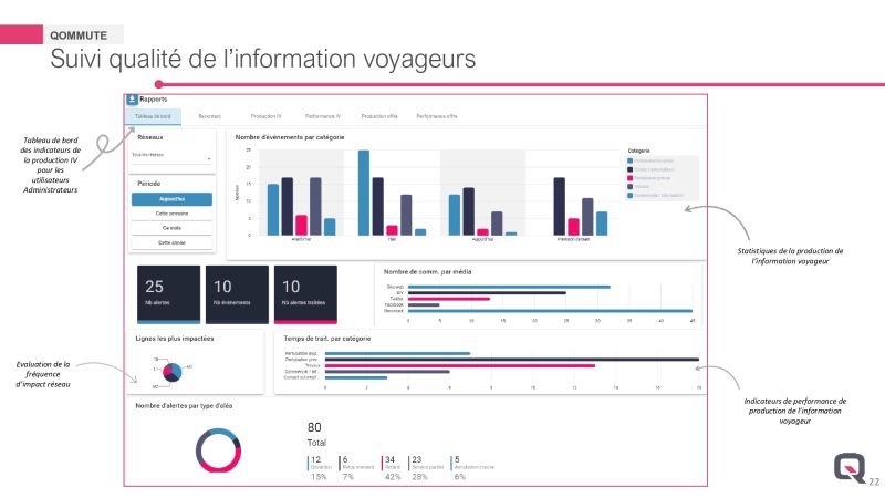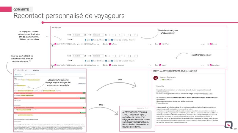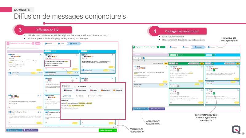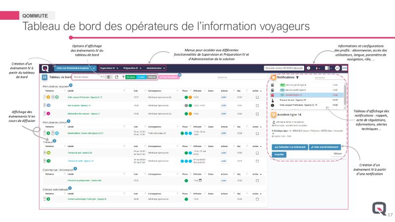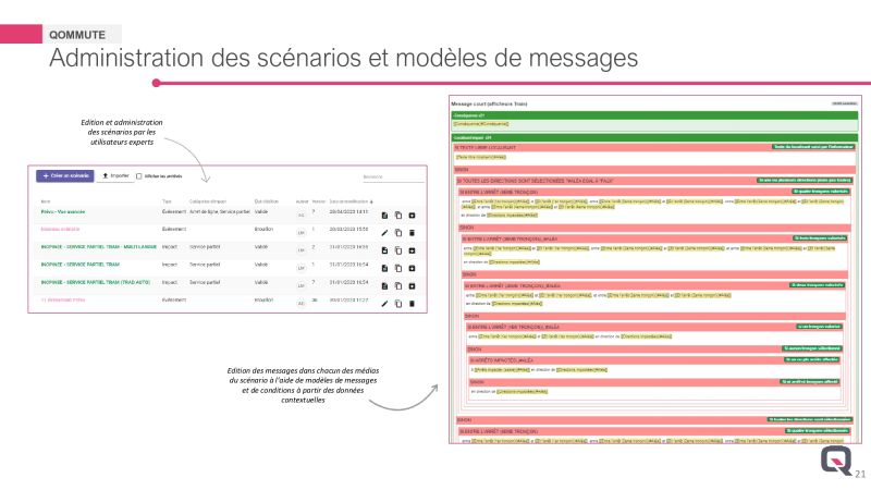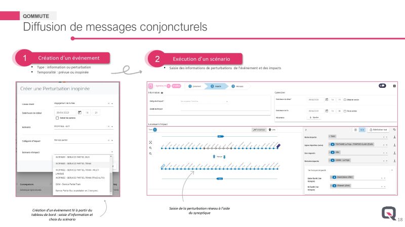 Grâce à un moteur de scénarisation unique et une plateforme enrichie par les retours de nos clients (réseaux urbains, ferroviaires, autorités organisatrices), Qommute permet d’anticiper les événements prévus ou inopinés et de garantir une information voyageurs claire et fiable aux usagers.
